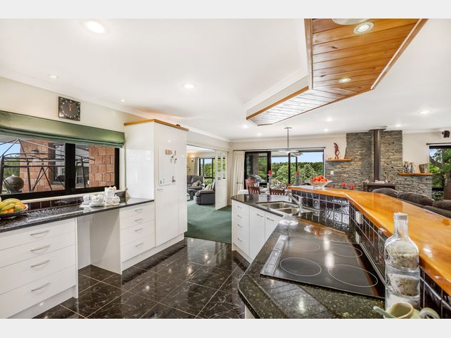 A floor-tiled entry leads to spacious open plan living areas incorporating a brilliant contemporary kitchen with under-floor heating, generous storage, stone benches, induction cooktop, double drawer dishwasher, double oven, walk-in pantry and breakfast bar with overhead lighting. The dining room, with raised wood-burning heater and decorative Schist detailing spills into the large family living room and outdoors to picturesque undercover and al fresco dining and recreation areas. There's also a large formal lounge room which opens onto the expansive under-cover tiled patio and lush gardens.